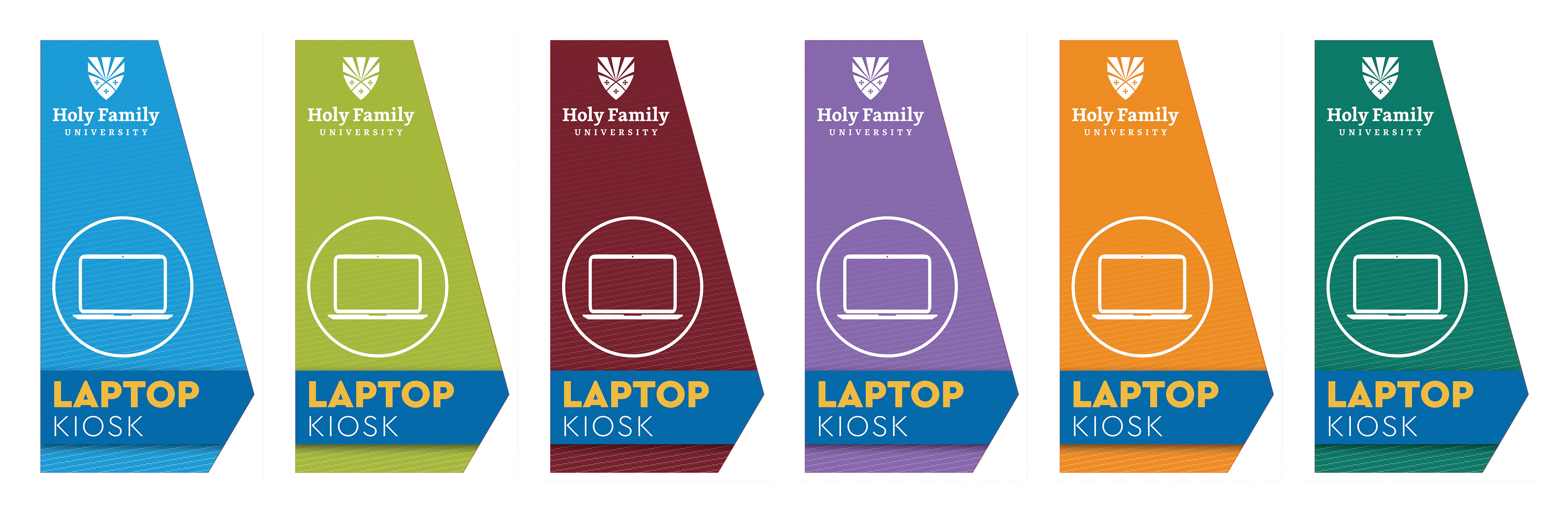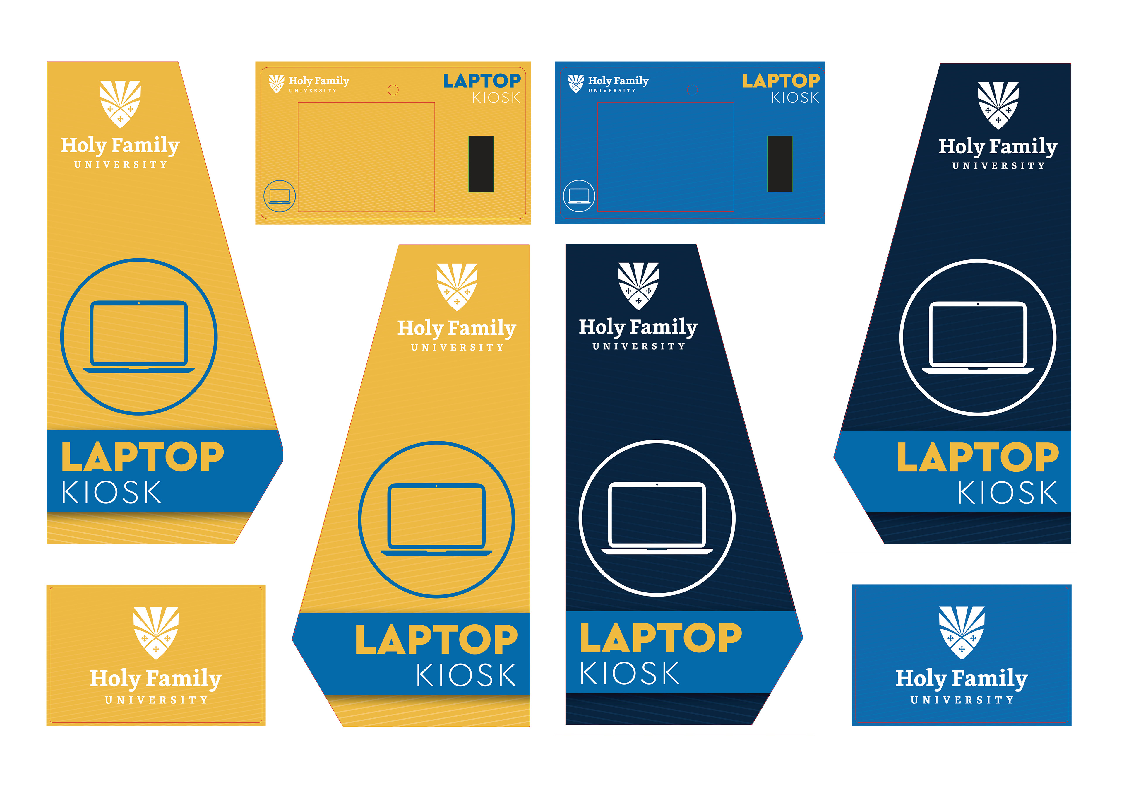 This project involved the complete visual wrapping of self-service laptop kiosks to align with Holy Family University’s branding. The comprehensive design covers the physical kiosk structure—including the faceplate and both left and right side panels—as well as custom skins for the laptops housed within the unit, ensuring a cohesive visual experience from approach to usage.